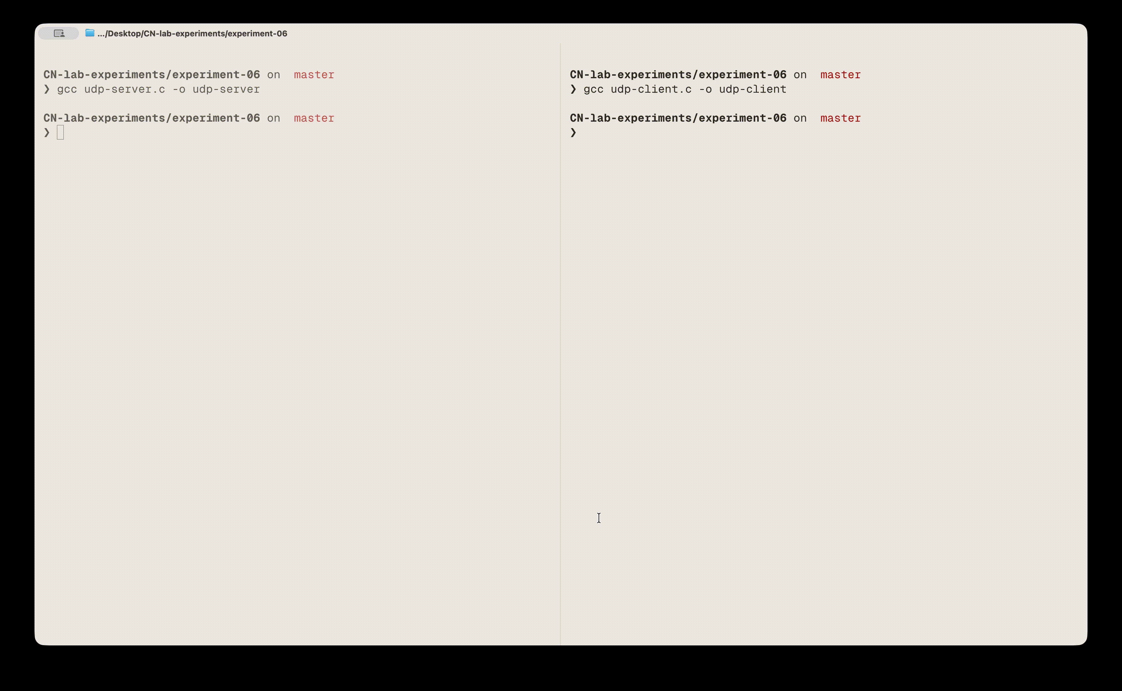 gcc udp-server.c -o udp-servergcc udp-client.c -o udp-clientWindows: install MinGW or use WSL